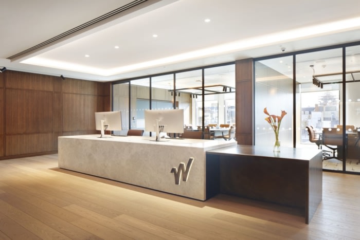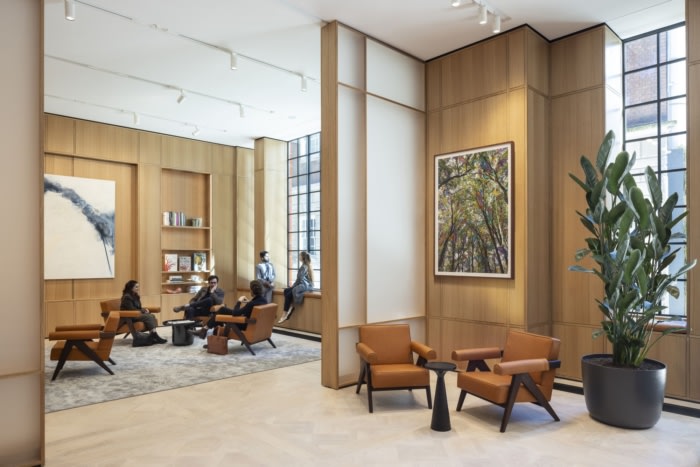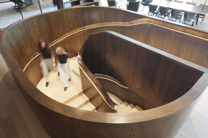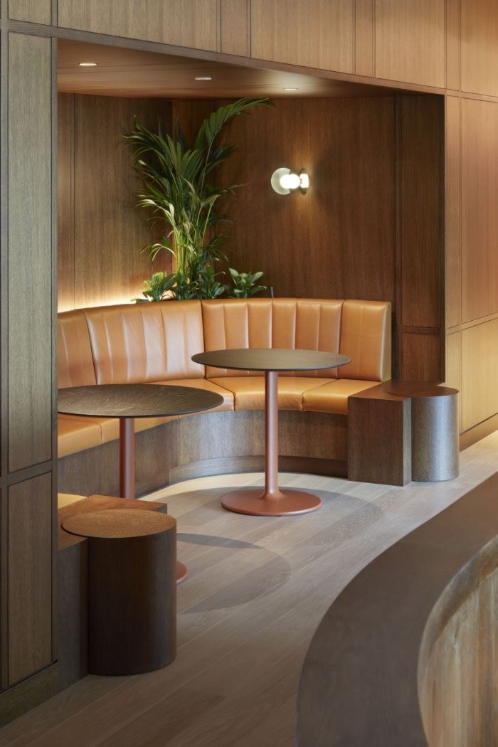 办公室中央的单色木框架创造了一个“交易剧院”,庆祝租户的核心功能。大屏幕传递实时信息,定制的协作桌创造了从专用工作区到绿色植物柔和区域的过渡。#办公室装修设计#