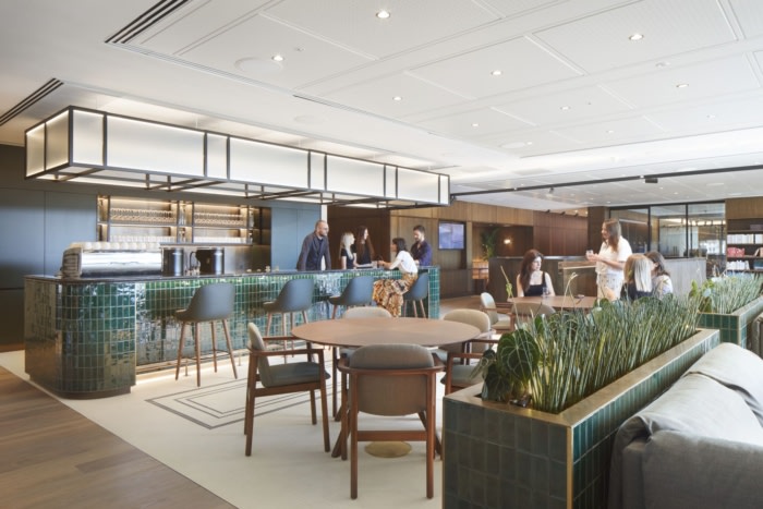 办公室装修设计:定制的协作桌创造了从专用工作区到绿色植物柔和区域的过渡