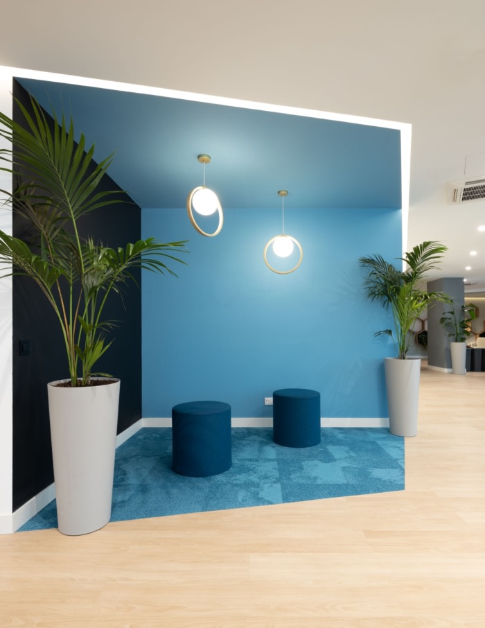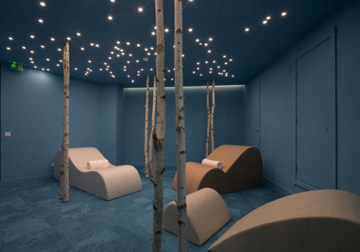 员工的福祉是关键因素之一。整个项目以酒吧和休息区为中心,这是整个团队社交和放松的交汇点。同样,还设计了一个卧室,员工可以在一天中短暂休息,让他们恢复精力。这个房间被故意漆成蓝色,允许员工连接设备来收听他们选择的音乐,并装饰着由光点组成的星座。#办公室装修公司#