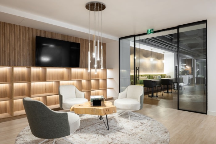当您进入办公室时欢迎您的灯也是手工制作的,此外,还为墙壁选择了经过认证的油漆,可以吸收碳并改善空间的空气质量。最后,使用由回收材料制成的家具,例如渔网。#广州办公室装修公司哪家强#