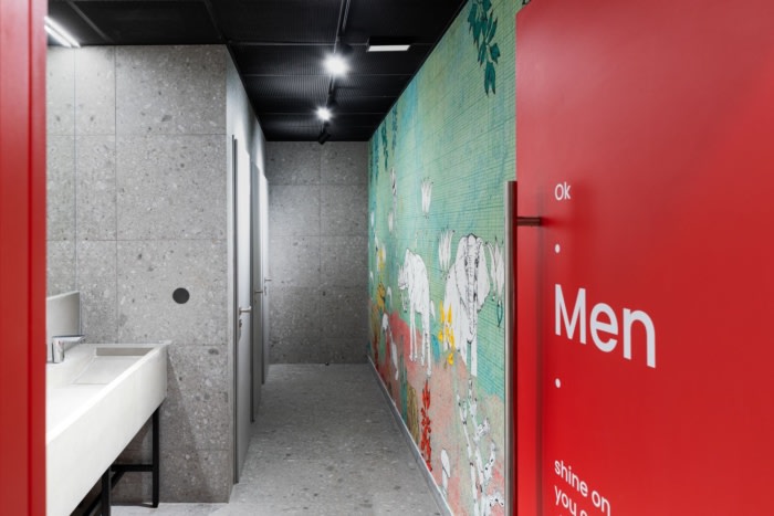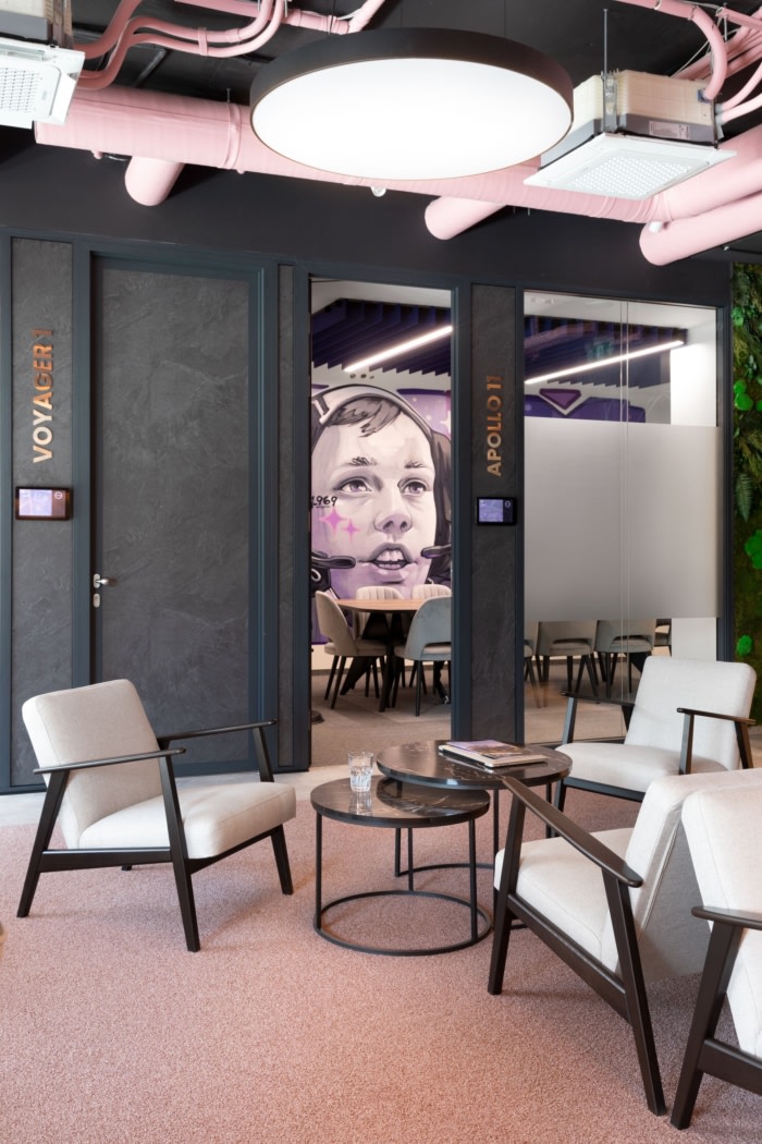 内饰的亮点是采用品牌颜色的外露服务,定义了步行道,平衡了内饰,并创造了独特的外观。另一个关键特征是各种形式的艺术。会议空间保留了太阳能主题,但在个性化的壁画和装饰中将其轻轻地扭曲为太空任务的主题。#公司新办公室装修实景#