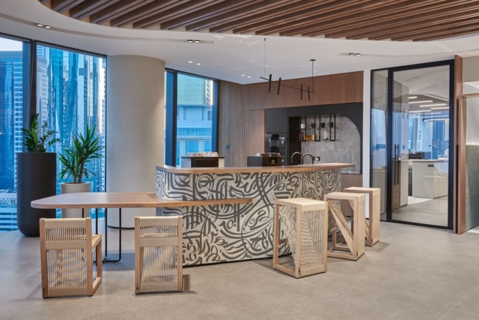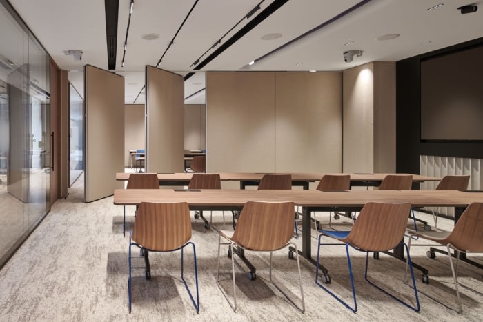 接待区被木质效果天花板包裹,可立即使空间变暖并抵消大理石效果的瓷砖。在接待处的右侧,大型多功能室配备了隔音墙面,旨在适应各种设置,由于采用了滑动式双层玻璃隔断系统,因此可以轻松展开或冷凝。除此之外,还巧妙地选择了不拘一格的照明和家具组合,打造了一系列会议室,这些会议室都展示了独特的外观,每个会议室都为用户提供了不同的体验。#办公楼装修设计#