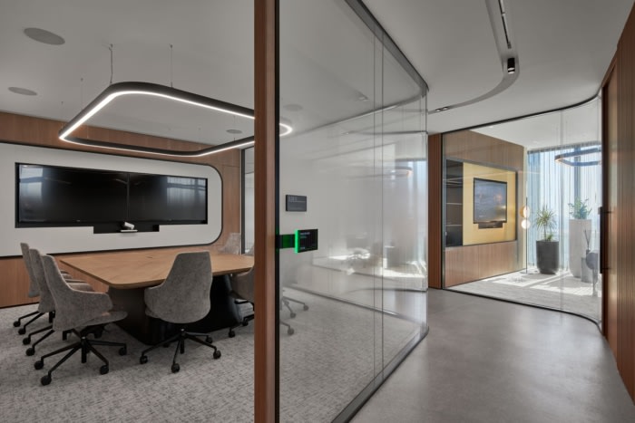 隐私是律师事务所的基本要素,考虑到这一点,在开放式区域内创建了被小型隔音屏障包围的“可防御”空间,与白噪声扬声器一起,有助于提供真正的保密感。#办公楼装修设计公司#