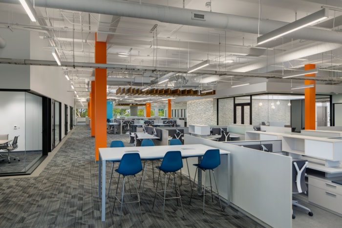 办公空间被组织在二楼,私人办公室最少,私人办公室位于外墙之外,让自然光深入空间。支持设施被分组在中间,以实现集中访问和空间效率。办公室设计解决方案还需要在个人生产力和团队效率之间取得平衡。该空间需要允许集中精力进行研发,同时也要重新定义工作场所的“私人”空间。#个性办公室设计案例#