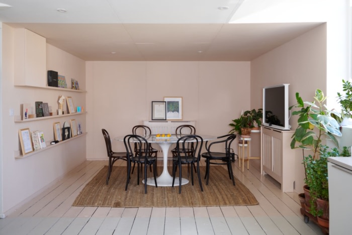 该设计的灵感来自该地区和邻近的里士满公园丰富的植物挂毯。他们与朗达工作室富有远见卓识的头脑合作,精心策划了一个散发着宁静和温暖的调色板。柔和的色调营造出宁静而诱人的空间,激发创造力。工作室空间的天蓝色彩绘天篷营造出室内外的联系,而浅陶土、茧状的会议空间在视觉上与当地建筑乡土相呼应。#办公室装修#