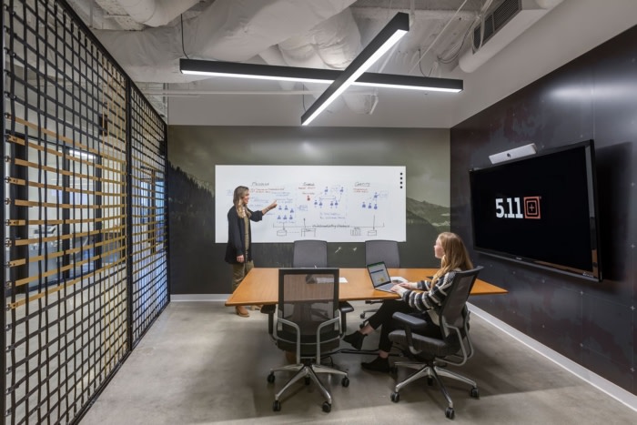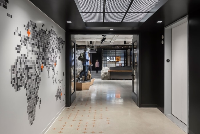 从员工和访客踏入总部的那一刻起,他们就被身临其境的品牌体验所笼罩。电梯大厅设有像素化的世界地图,该品牌标志性的“目标”图标标记了全球的办公和零售地点。这些图标是磁性的,可以随着企业的扩展灵活地添加更多位置。目标图标还被用作墙壁和地板上的寻路图形,以向该品牌的户外爱好者根源致敬。一块巨大的人造花岗岩巨石作为接待中心,突出了木材和钢制前台;一条走廊模仿了穿越峡谷的体验,贯穿整个办公室,将自然元素融入零售式环境中,展示他们的最新产品。#总部办公室设计#