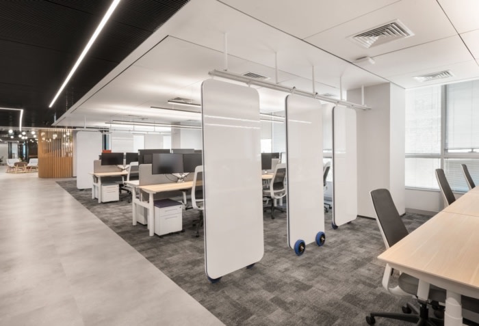 大量使用黑白,主要体现在开放空间区域,旁边是明亮而强烈的蓝色、绿松石色、橙色、粉红色和紫色,从会议室中脱颖而出。线性照明装置沿着通道运行,并在黑色线性天花板的背景下产生流动的运动。#办公室装修设计#