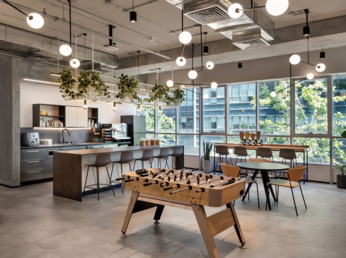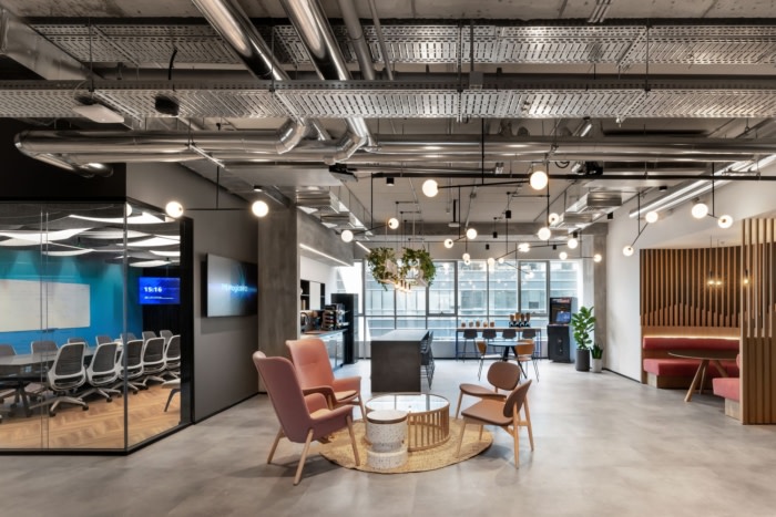 进入楼层后,您会发现一个宽敞宜人的自助餐厅,设有休息区,游戏和装饰照明设备。储物柜也位于该区域,员工可以存放他们的个人物品。在楼层自助餐厅附近,有一排大小不一的会议室,为员工服务,并在嘈杂的入口和工作区的自助餐厅之间形成缓冲区。#办公室装修设计案例#