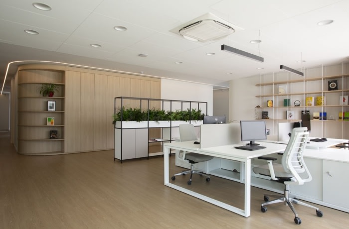 室内庭院的存在以及OSF希望营造温暖温馨的氛围等因素自然导致建筑师采用以植物为基础的自然方法,他们希望反映在木材和石材等材料的选择以及油漆颜色和家具的选择中。#办公楼设计装修公司#