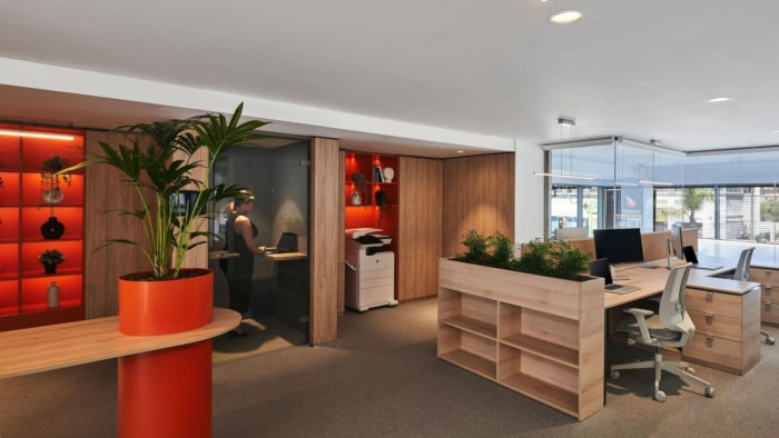 设计师们使用线性波状灯具来巧妙地强调地板结构的层次感。在这个区域,客户受到一个简洁的接待区、一个舒适的等候区、一个宽敞的休息室和一个用于保密交谈的电话亭的欢迎。楼层设有会议室、开放空间、私人办公室和用餐区。为团队和公司客人安排了一个带有休闲壁龛和装饰架子的时尚衣柜。为植物组合物保留了空间,植物成分是灌木植物,模仿自然岛屿植物,并补充了整体轻松的美学。#广州办公室装修设计公司#