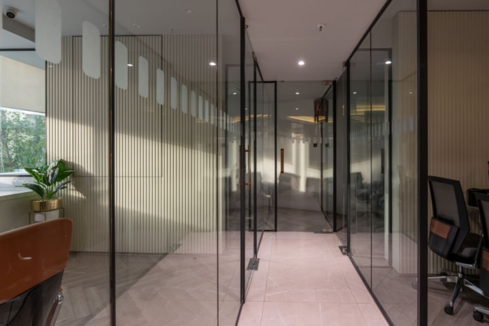一楼被塑造成一个极简的现代空间,使用鲜艳的色彩和清新的美感。彩色玻璃面板划分了各个区域,同时为空间注入了健康的亮度。富丽堂皇的二楼既是私人的,也是公共的?;⌒文厩浇筇糜肽诓靠占涓艨?,为参观销售休息室和画廊的客户提供隐私。内部相对更加开放,玻璃隔断在原本有限的地面空间内营造出宽敞的错觉。由于客户会议和项目演练主要集中在这一层,因此使用抛光大理石、光泽贴面和层压板、优雅的墙板和经典织物提升了华丽程度。#办公楼装修公司#