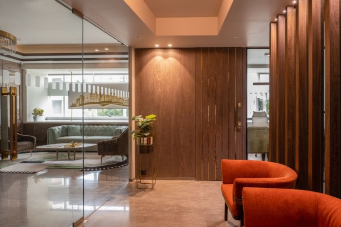 办公楼装修:弧形木墙将大堂与内部空间隔开 玻璃隔断在原本有限的地面空间内营造出宽敞的错觉