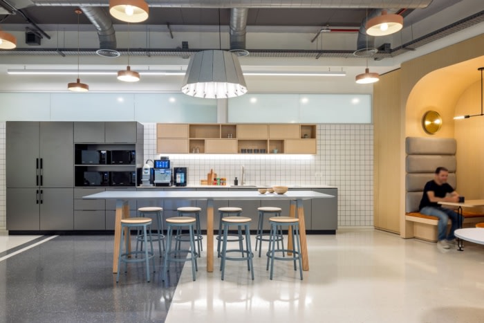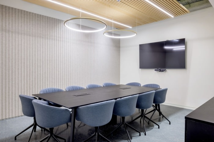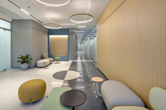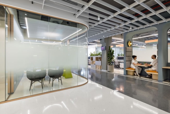 走廊的右边是办公室的入口,打开门后,可以看到一个机器人设计的中央广场和三个焦点室,用作员工可以在更私密的环境中举行小型会议和工作的空间。该区域还规划了小厨房和咖啡角,为了创造差异化并将其定义为繁华的中心,设计师在其上方创造了一个漂浮、通风和吸音网格天花板,内衬吸音织物,因此无论您从哪个角度看,都会绝对清楚这是巨大建筑群的中心。#办公楼设计装修风格#
