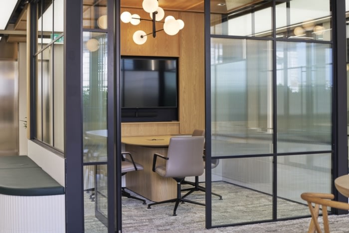 隐藏的门提供通往客户端会议室的通道,确??突г诜梦势诩浠竦媒魃骱妥ㄒ档奶逖?。接待区旨在欢迎访客,并在其后面设有一间会议室,交通便利。此外,客户区还设有开放式会议空间和设备齐全的小厨房,营造出热情好客的协作环境。#办公室室内设计公司#