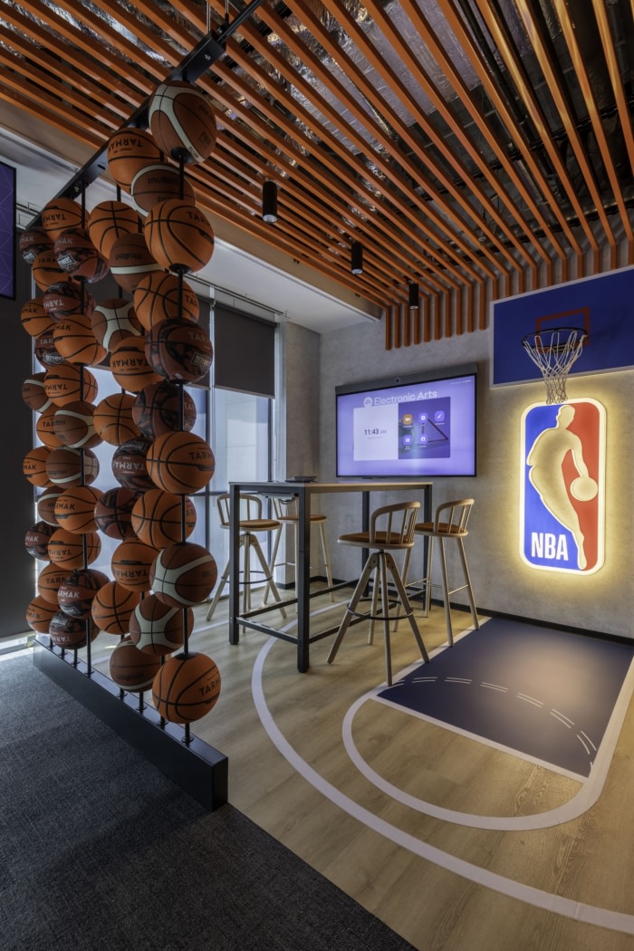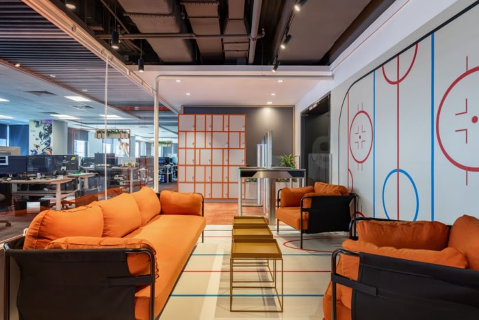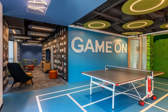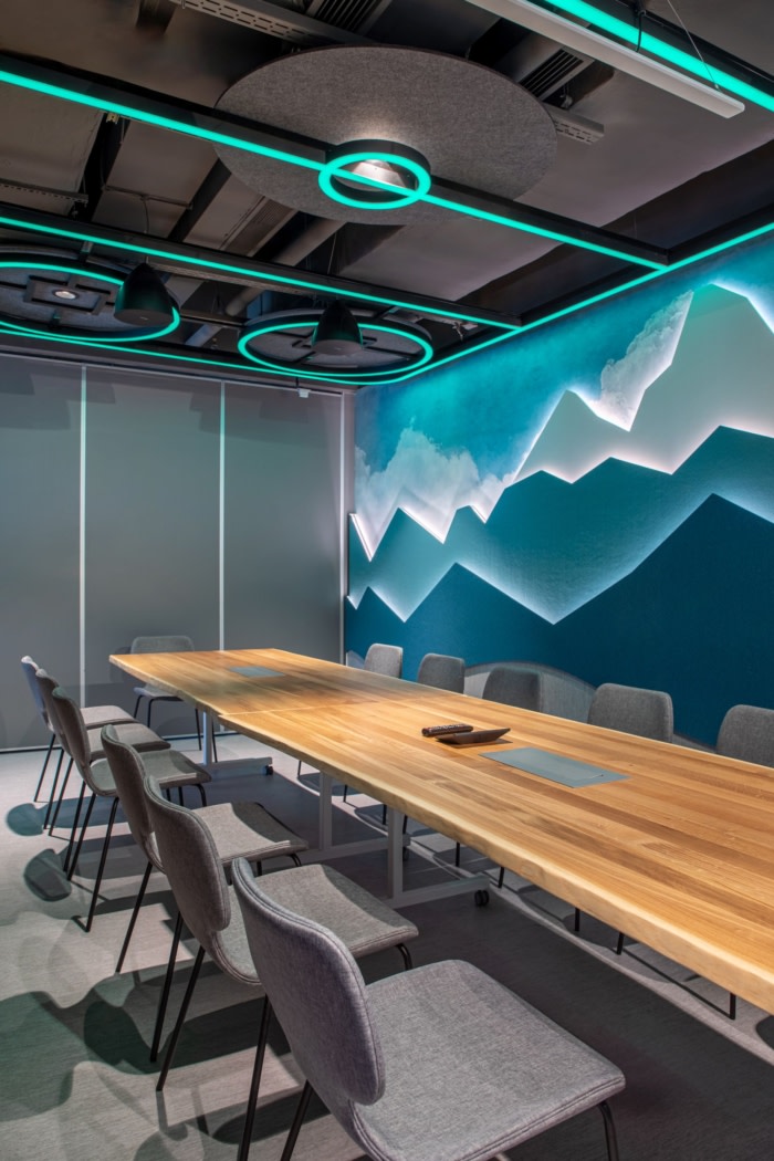对于不同的协作区域,从企业开发的游戏中选择了标志性的场景,建筑师巧妙地将其转化为现实。其结果是一个办公空间,其特点是工作环境的清洁度与分散在空间周围的“主题区域”的颜色和形状爆炸形成鲜明对比。#办公室设计装修方案#