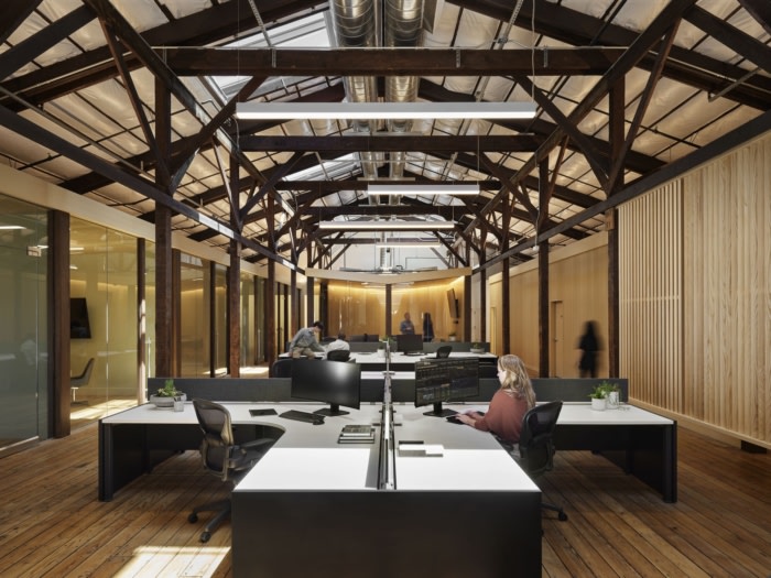 私人办公室以落地玻璃幕墙和木质细节环绕周边,精心调整尺寸以表达空间的现有柱子。利用这些现有的树状结构和散布在中央空间的天窗,该设计创造了一个开放的办公区域,感觉就像森林中的空地。当您进入时,主要焦点是一个多面风化钢雕塑,让人联想到劈开的红木。这座雕塑一直延伸到天窗,既为开放式办公室提供了隐私,又是空间的统一元素。#办公室装修设计公司#