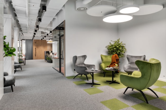 在家具和照明中使用黑色元素增加了空间几何形状的清晰度,促进了集中注意力并促进了场所内的导航。明亮、阳光明媚的黄色,在交通区的墙壁、照明设备和淋浴间的设计中重复出现,为重新聚焦的空间增添了活力和充满活力的氛围。#办公室装修风格#