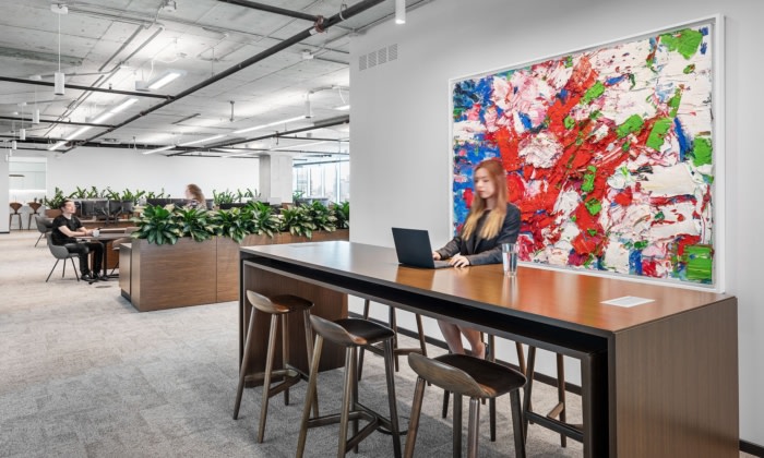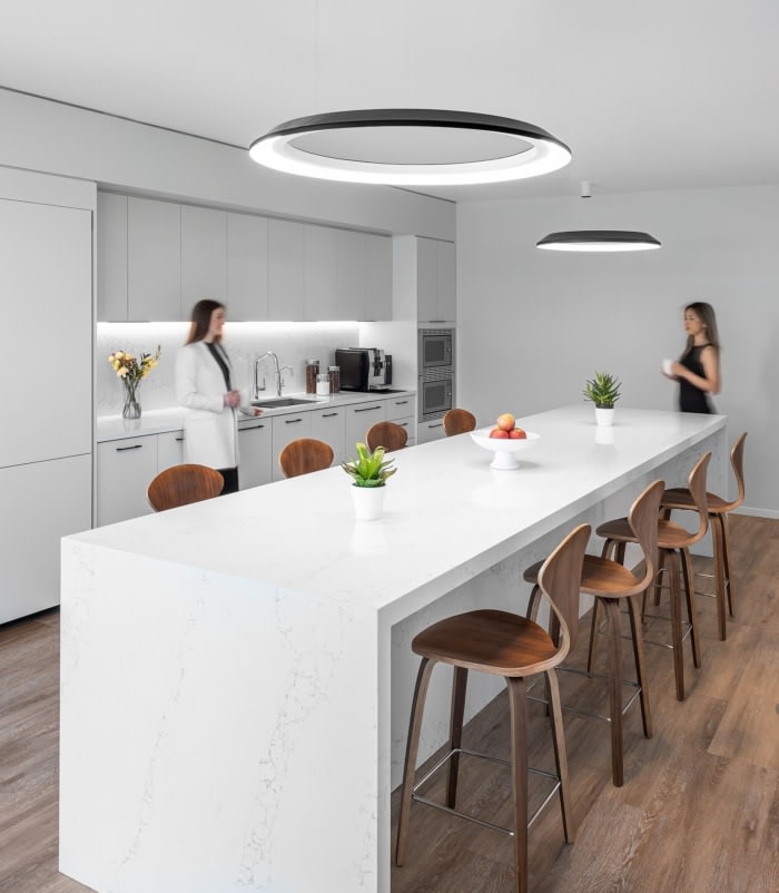 在服务器中,时尚的橱柜和整个厨房岛台的柔和纹理营造出一种趣味感和平衡感,与木质座椅的曲线相得益彰。隐藏在拐角处的休闲空间提供了一个宁静的休憩之所,大窗户可以欣赏到远处令人难以置信的景色。建筑细节和饰面从接待区一直延伸到开放式办公室,温暖的饰面和亲自然性与凉爽的混凝土天花板相得益彰,为员工营造出健康和舒适的感觉。#办公室装修设计公司#