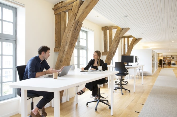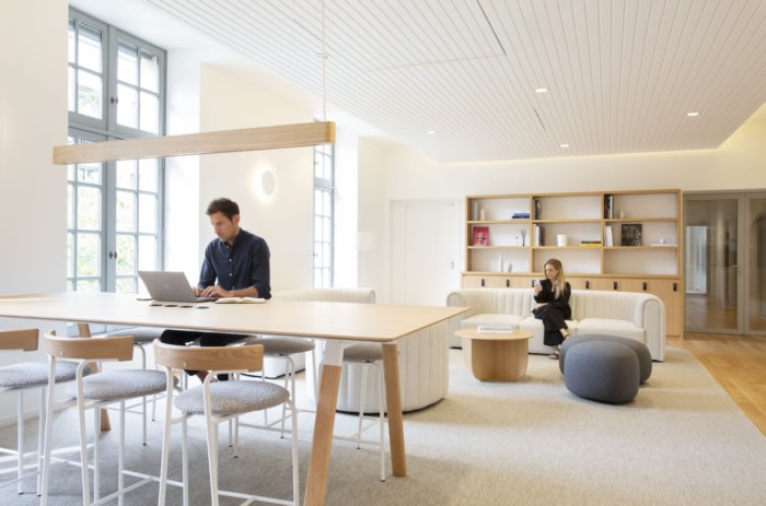 这是一座受?;さ墓偶?,拥有一系列传统特色,包括优雅的原始窗户、装饰性内部装饰条和时尚的镶木地板。该方案的独创性来自于传统特征的结合、低调而优雅的调色板以及寓言式的空间使用。自然光决定了设计中的空间分配,协作和社交空间占据了紧邻建筑传统窗户的外围区域,而会议室和办公室则更靠近空间的中心。#办公室装修设计#