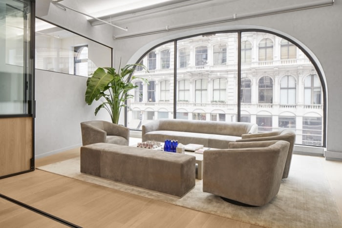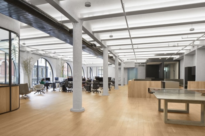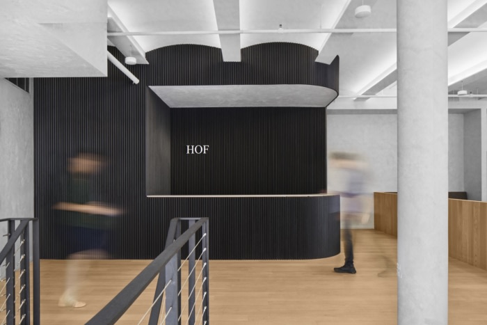 办公室设计的灵感来自日本极简主义和野蛮主义的微妙而俏皮的混合。定制的黑色钢和玻璃办公室隔断的设计类似于日本茶馆的墙壁,橡木地板将它们包裹起来,形成护墙板。接待处和小厨房都覆盖着黑色的手鼓,带有混凝土色调的石英柜台。办公室的墙壁涂有灰色的石灰水洗漆,也类似于混凝土。为了应对拥有如此多坚硬表面的办公空间的声学挑战,安装了一个降噪系统来掩盖相关的混响和回声。最终结果是一个视觉温暖、光线充足、舒适的办公室,激发了创造力和协作。#办公室装修设计公司#