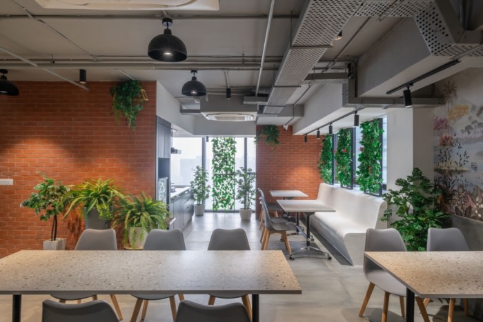 咖啡馆被设计成带顶棚的大露台。水泥灰色瓷砖地板与水磨石桌面相得益彰,并增强了空间的绿色。用陶土包覆的砖块为空间增添了温暖。定制设计的墙纸是这个房间的亮点,为空间增添了活力。该空间还装饰着悬挂植物和盆栽植物,为办公室增添了绿色植物。咖啡馆旨在成为员工休息、充电和与同事社交的地方。#办公室装修公司排名#