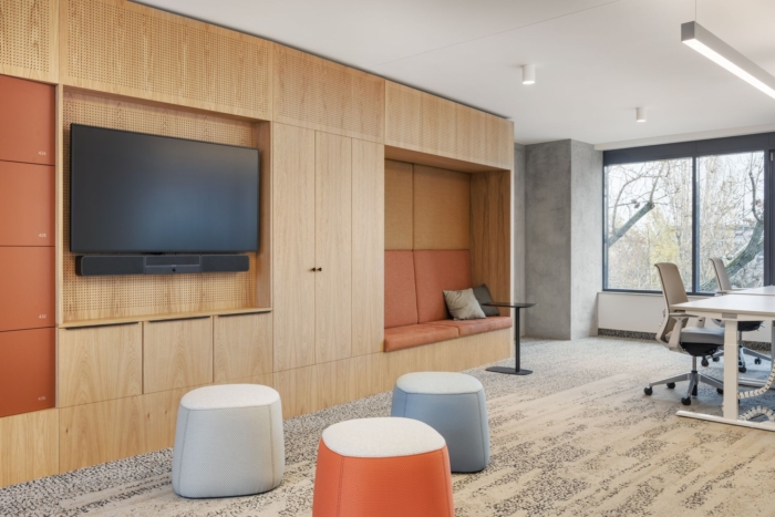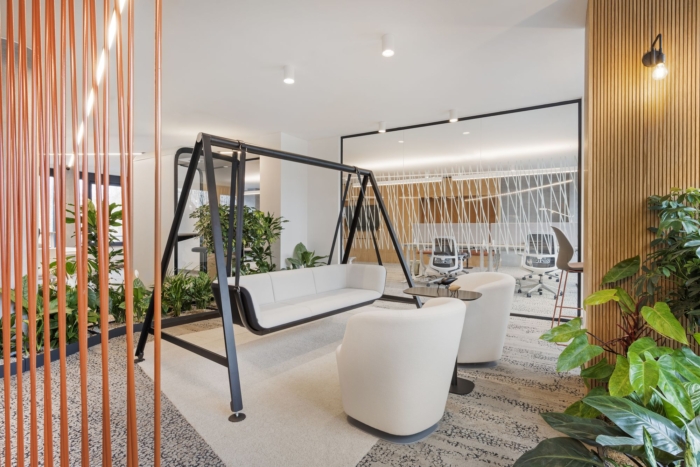 绿岛植物不仅改善了空气质量,还提升了空间的设计质量。绿色岛屿嵌入在高架地板上,其中还包含灌溉系统和主要热带水培植物的特殊照明。大面积的绿色植被与室内设计师使用的自然、温暖、柔和的色调和木质材料完美协调。#办公室空间设计#