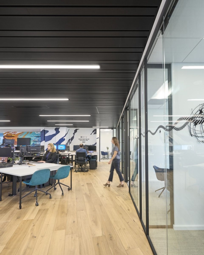 设计团队对建筑的独特形状提出了挑战。独特的布局营造了一种透明感,主要是开放式概念的工作站和带有玻璃门和滑动玻璃门的办公室,办公室之间的间歇性玻璃面板以提高可见性。#办公室装修公司#