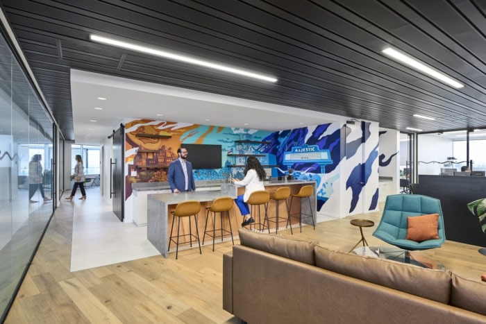 该设计包括该地区特有的混合材料,包括定制设计的接待台,采用石灰石、原边木材和金属装饰,咖啡吧和休息室配有牛皮和皮革家具。#广州办公室装修公司排名#