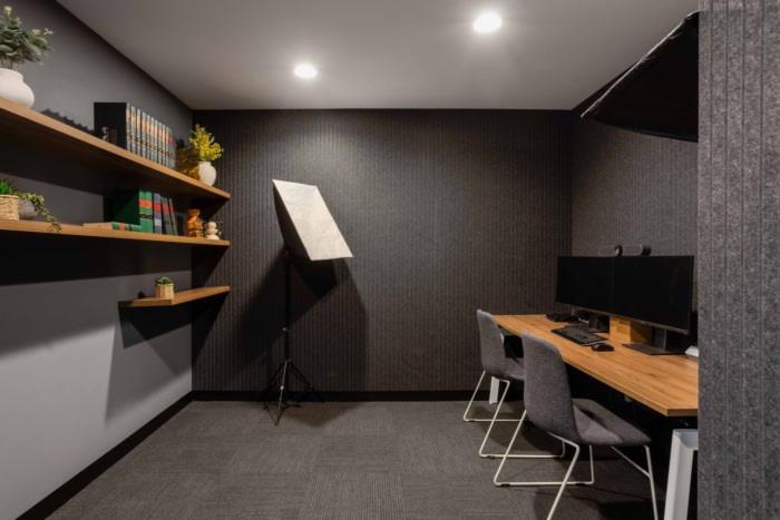 会议室由中央的可操作墙隔开,具有双重用途。它变成了一个大型、正式的会议空间,旨在给客户留下深刻印象并促进有影响力的讨论。然后,它可以轻松转换为两个更小、更实用的会议室,专为更亲密的协作会议量身定制。#公司办公室装修设计方案#