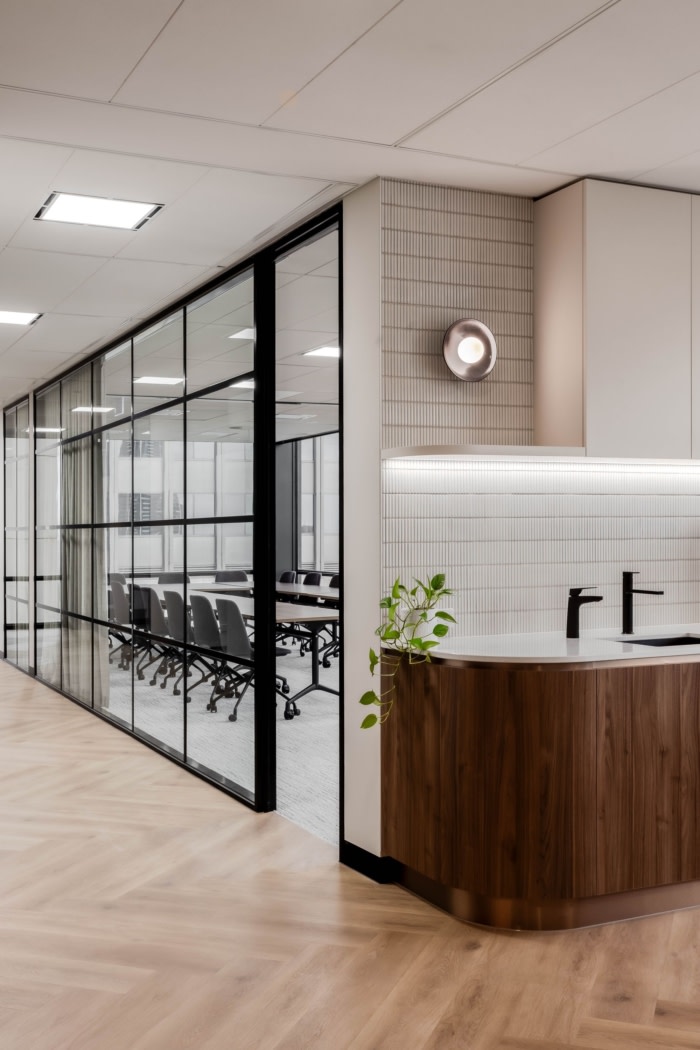 一进门,迎接住户的就是迷人的城市全景,充足的自然光增强了质感和材质。这个迎宾区包括沿窗的长椅座位、带长凳式座椅的设备齐全的厨房,以及一个宽敞的休息空间,旨在兼具休闲会议场所和灵活的工作空间,供笔记本电脑使用或即兴讨论。走廊入口墙壁上的微妙弧度起到了有机的引导作用,将居住者顺利地引导到会议室和办公室的其余部分。#公司办公室装修设计#
