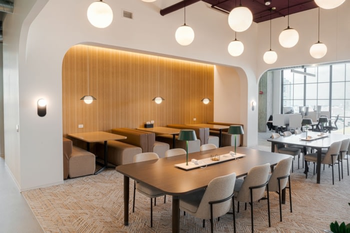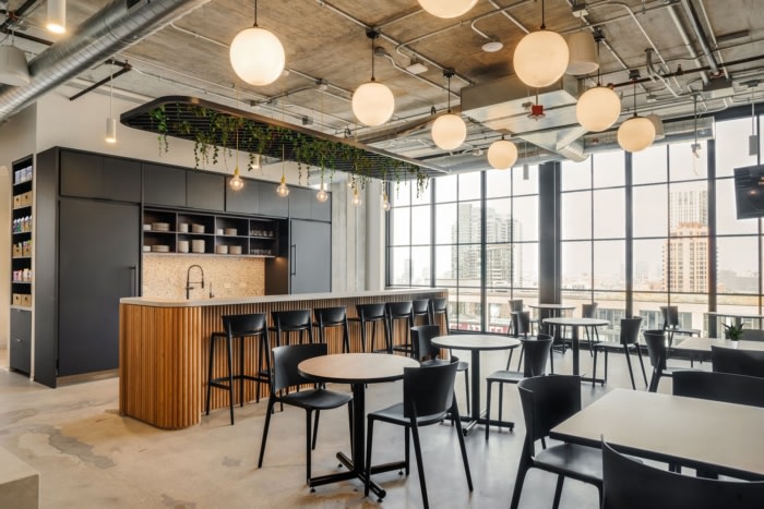 突出的设计元素包括接待台后面的定制开槽特色墙,在不影响落地窗自然光的情况下提供隐私,以及醒目的墙纸,呼应企业的创新和表现精神。车库门和可操作的隔板优化了全员会议的空间,而高端休息区和游戏室则鼓励员工互动。#办公室装修设计方案#