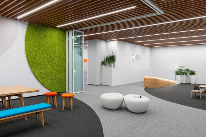 设计的核心是受企业品牌启发的强烈图形元素,并由建筑师巧妙地重新诠释。这些元素表现为流动、起伏的形式,贯穿整个空间,在各种功能中作为统一的视觉主题。此外,色彩点缀的策略性使用进一步勾勒出不同的区域,从接待区和会议区的正式优雅到协作空间的活力。同时,放松和灵活的工作区提供了一个宁静的休憩之所,培养了创造力和幸福感。#办公空间设计公司#