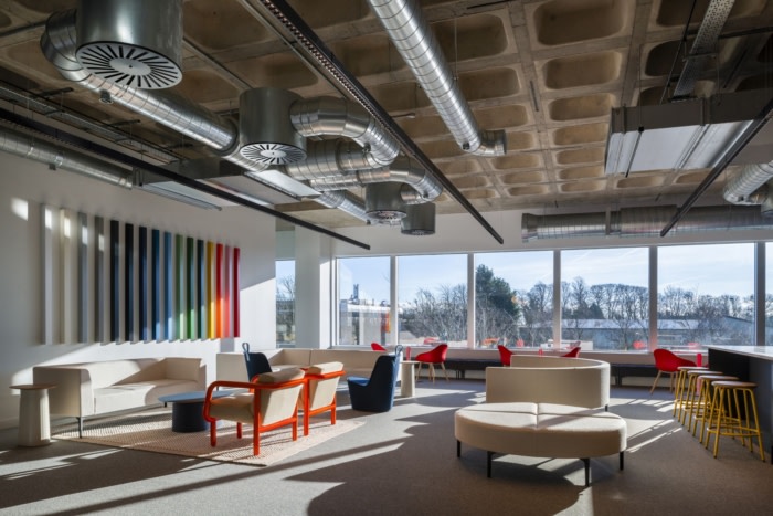 进入办公室后,人们穿过一条黑墙走廊,通向一个轻松的触地空间,里面摆满了休闲家具和咖啡桌,两侧是俯瞰大楼周围树梢的巨大窗户。#办公室设计装修公司#