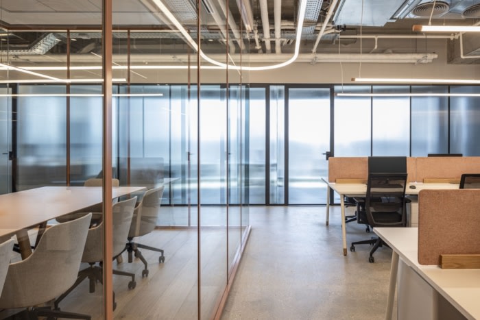 裸露的混凝土天花板自豪地展示了公用设施和系统,而原来的混凝土地板仍然没有被覆盖,有助于营造通风的氛围。玻璃隔断、带有独特覆层的条纹墙和可调节的照明设备为空间注入了节奏和动感,在休闲设计与精心处理之间取得了平衡。在这种休闲与策展相结合的环境中,创造力蓬勃发展,再次证明最好的想法出现在鼓励无限制想象力的空间中。#简约办公室装修#
