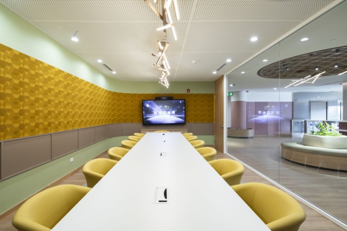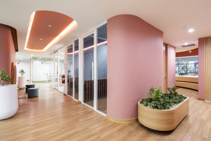 通过实施不同的暖色和纹理,创造了一个混合用途的空间。它有不同尺寸的私人办公室,不同主题的会议空间,从更正式的房间到更灵活的房间,有模拟我们家客厅的空间,个人会议空间,电话亭,产房,健康室,洗手间,以及一个开放的共享区域,看起来更友好,更温馨。#时尚办公室装修#