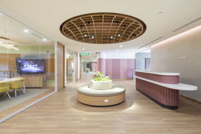 公司办公室装修:通过实施不同的暖色和纹理,创造了一个混合用途的空间