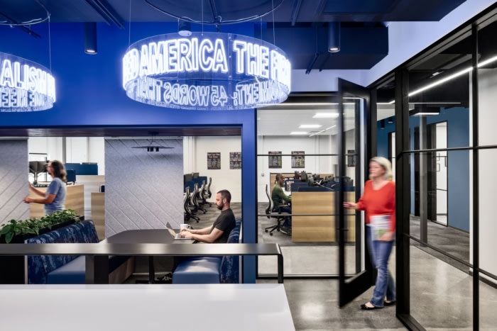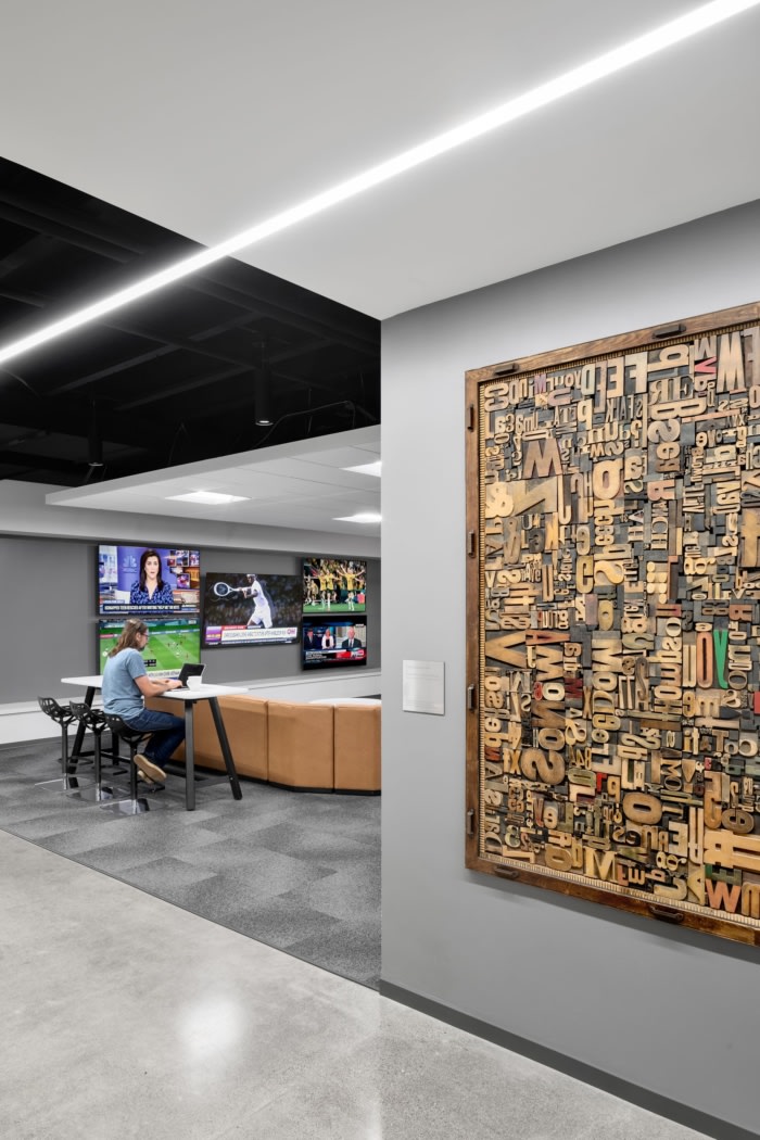 办公室设计体现了开放的新闻编辑室概念,服务于不同的工作方式和协作工作。家具解决方案有助于对突发新闻的快速响应,支持报纸快速信息传播的需求。休息室是一个特别受欢迎的空间,它结合了滑动吸音板以提供适应性,与营销团队无缝连接,同时提供根据需要扩展或封闭空间的选项。#办公室装修设计方案#