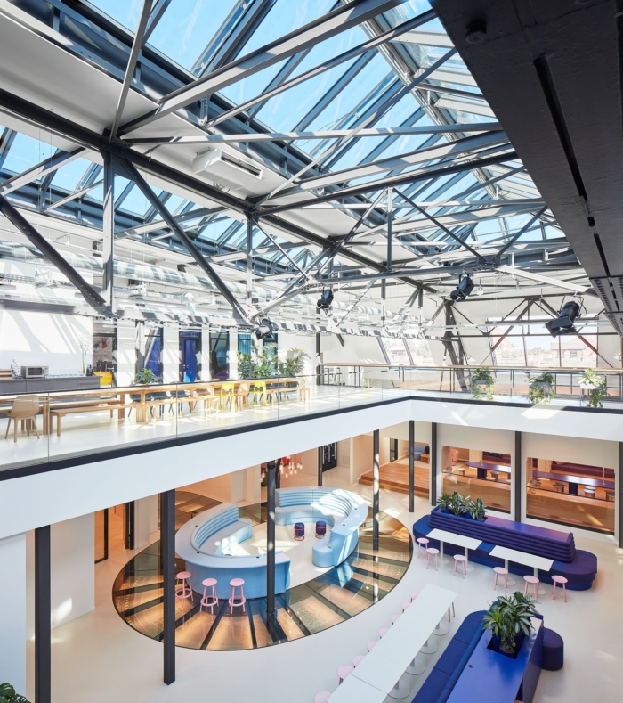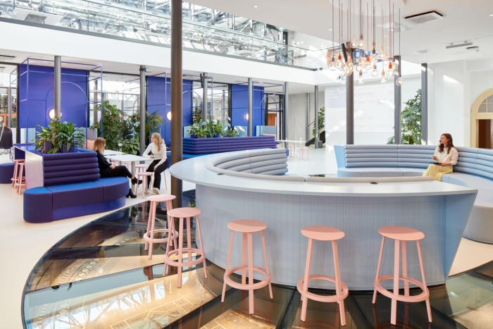 在开放的公共区域,一个浅蓝色的椭圆形长凳沿着前女士游泳池的轮廓排列。它作为一个多功能的交汇点,可以用作内部的长凳和外部的柜台。周围的落地窗令人印象深刻地强调了裸露的瓷砖。#专业办公室装修设计#
