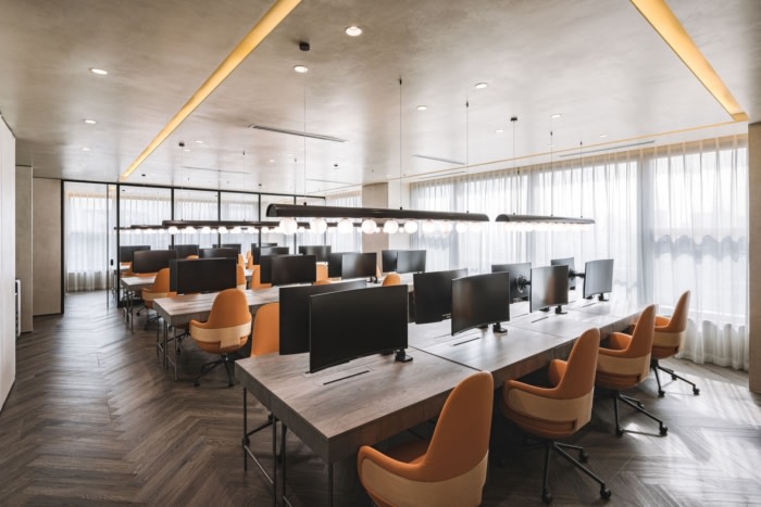 从客户的简报中汲取灵感,后台办公区采用开放式布局,营造出协作和创造性的工作空间环境。落地玻璃面板与宽大的窗墙相映成趣,为空间注入了开放感和通风优雅感。量身定制的照明灯具,精心制作以反映公司的标志,以及模拟日光的冷色调LED灯,有助于激发员工的思想,促进专注、专注和生产力。#网红办公室设计装修#