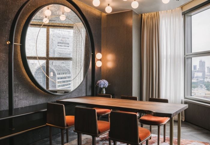 对面的茶室装饰着现代而传统的东方环境,邀请游客沉浸在昏暗的灯泡营造的氛围中,让人联想到公司的标志。一面东方古董镜子,象征着客户与公司之间的桥梁,增添了一丝中国古代的魅力。精心挑选的家具散发着奢华的气息,而带有黄铜腿的原木桌与房间内的其他元素相得益彰。茶室注入了东方和朴实的元素,迎合了商务礼仪的偏好,对话围绕着中国茶的细致商业计划展开。#公司办公室设计装修#