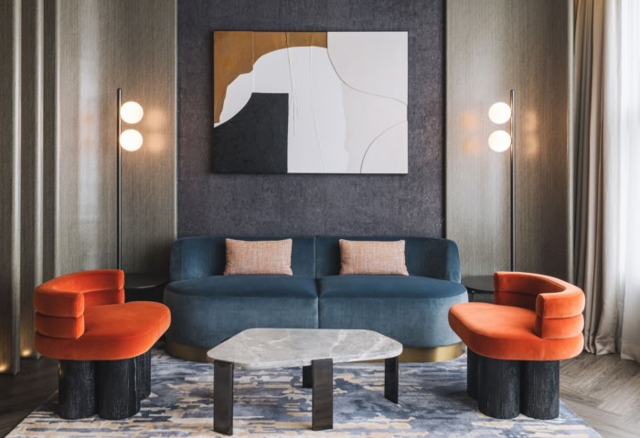 宽敞的接待休息室装饰着雅致的人字形图案地板、纹理漆墙和天花板,以及作为隔板的优雅木鳍片,展示了对细节的一丝不苟。以公司品牌图案为灵感的迷人壁纸热烈欢迎客人的到来。在保持总体主题的同时,空间内的每个房间都拥有独特的视觉形象。#办公室设计装修#