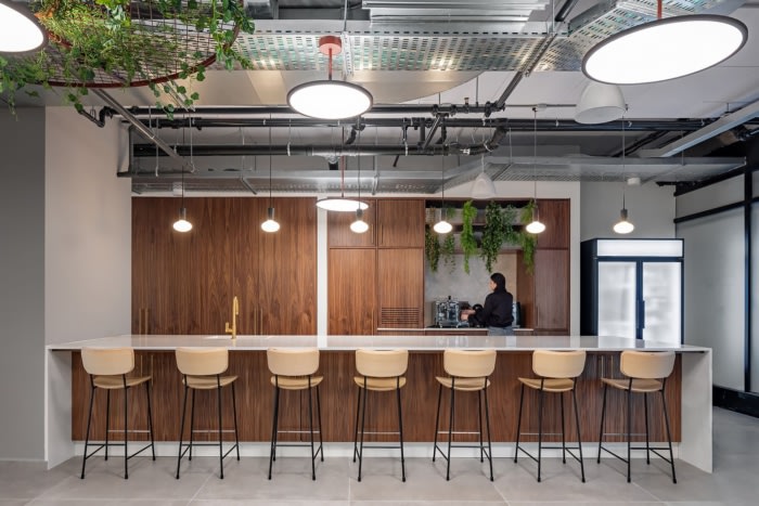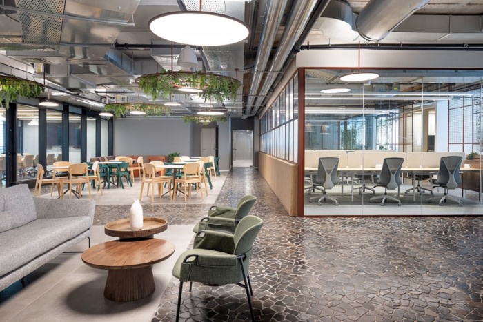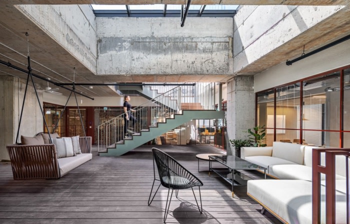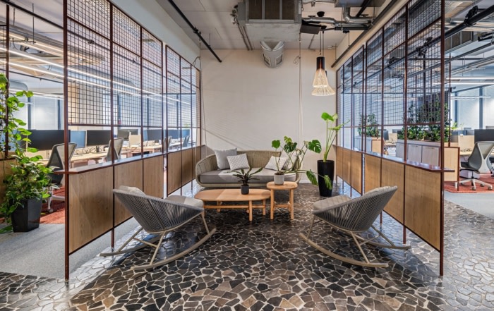 与典型的办公室美学不同,该设计旨在为公司的年轻员工营造一种温馨的氛围。石材、竹子、混凝土和木材等天然材料将室内和室外空间无缝融合,促进了从一种到另一种的和谐过渡。值得一提的是,九楼设有宽敞的商业厨房,所有餐点均由公司内部专业准备。天窗点缀在天花板上,引入自然光,并促进直接流通到宽敞的屋顶,从那里可以欣赏到特拉维夫和各种引人入胜的聚会区的全景。两个设计优雅的楼梯进一步增强了楼层之间的垂直连通性,促进了员工之间的流畅运动和互动。#办公室室内装修#