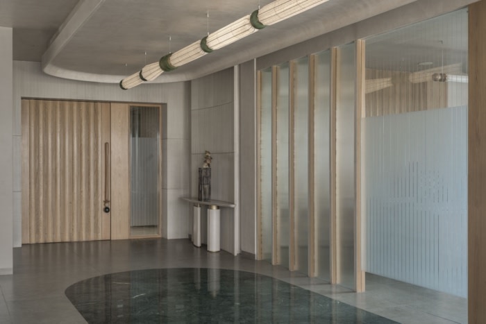 设计师向客户提出了一个简洁的私人工作空间,即符合Vaastu标准的私人工作空间,向客户反映出他们的个性,并散发着低调而精致的奢华气息,设计师专注于创造一个诚实的空间,采用中性温暖的色调和纹理,点缀着天然木材和绿色。当游客进入时,他们的视线被动态的 29 英尺雕塑光宣言作品引导到雕塑般的接待台之外的开放式露台阳台上,这是这部视觉交响乐的核心。#办公室装修公司#