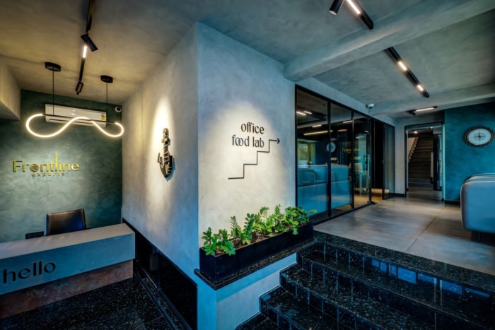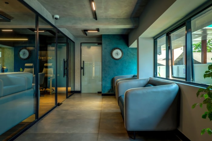 深入办公室,MD室兼作会议空间,由光滑的轮廓推拉门隔开。绿色和灰色调与黄色和黑色大理石的点缀融为一体,营造出精致的氛围。融合了以船舶为灵感的元素,如黄铜纸船和突出的海盗轮,增添了一丝航海奢华。木板地板进一步增强了海洋主题,让人联想到一艘古船的甲板。#办公室设计装修公司#