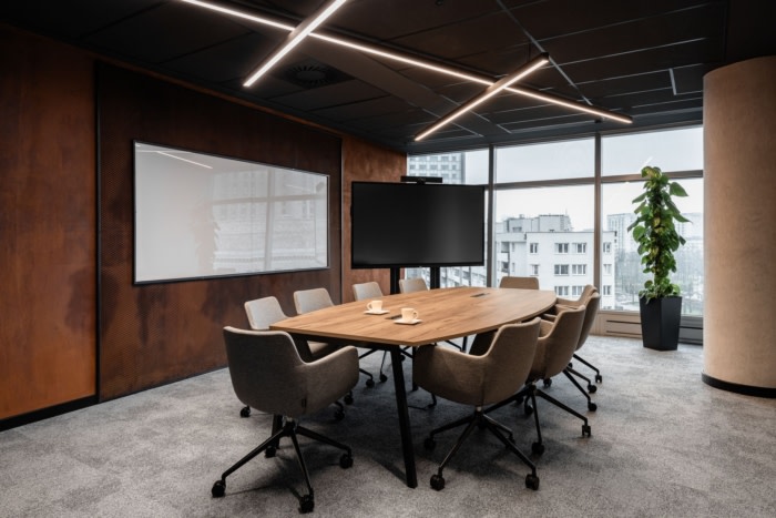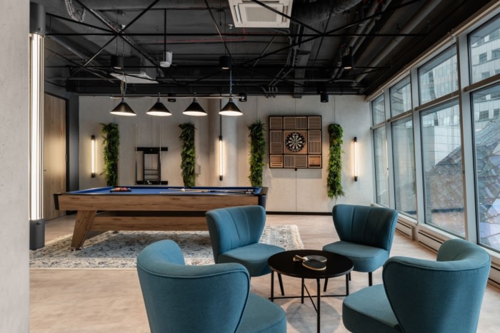 联合办公厅和会议室的设计风格相同、统一且一致。深色的天花板上点缀着动态排列的 LED 灯具。室内装饰由门、台面上的木材和墙壁装饰形式温暖。房间中间是各种柔软的座椅和咖啡馆风格的地毯,不容错过顶级的切斯特菲尔德沙发。该区域还提供98英寸电视和游戏机。从金色露台的圆顶望向,您还可以组织台球比赛,在街机上玩耍,并测试自己向目标投掷飞镖。#公司办公室装修方案#