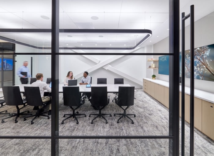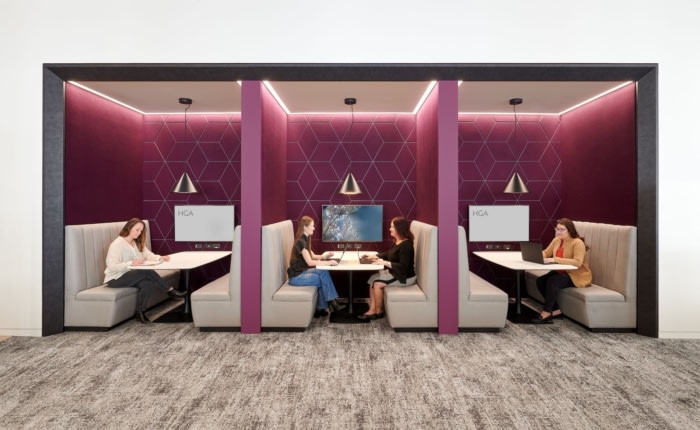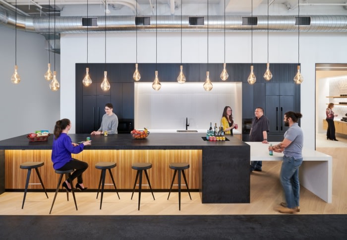 优雅而永恒的办公空间以温暖的木材、黑色金属以及海军蓝和李子色的色彩飞溅为特色。每位员工都有机会为新的混合办公室贡献设计理念。新办公室包括不同类型的工作站、协作空间、Zoom 房间、电话亭、小型会议室、设计实验室、饰面图书馆和其他专门设计的工作空间。办公室使用内部工位预订系统。#办公空间设计公司#