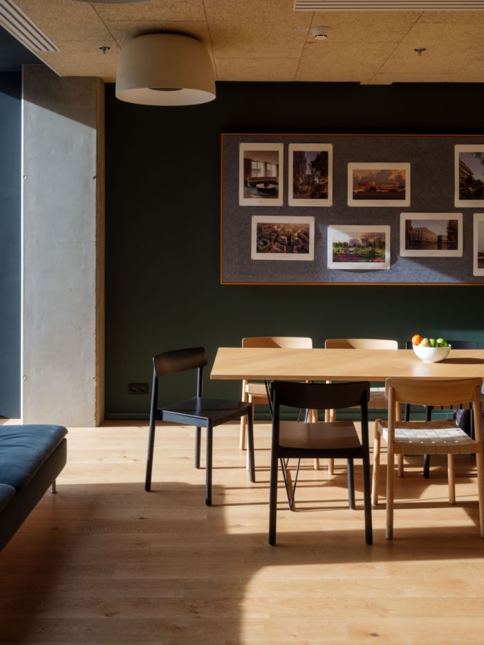 两个工作室的办公室都位于一楼。内饰以自然的调色板为主,辅以大胆的色彩点缀。工作室设有多个会议室、一个样品室、一个车间和一个模型室。然后,工作场所本身被划分为封闭空间和两个开放式开放空间,分别用于小型团队和两个开放式开放空间,分别用于室内设计、建筑和城市规划领域的团队。两间会议室可用于会议和头脑风暴:一间光线充足,配有玻璃角,而另一间则更深、更优雅,为专注的创意协作提供了更亲密的环境。#厂房办公楼设计装修公司#