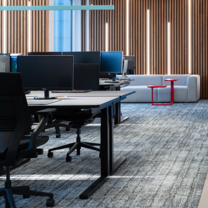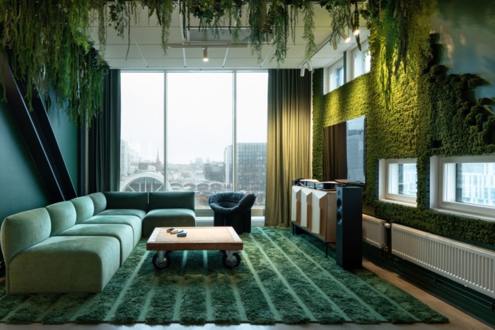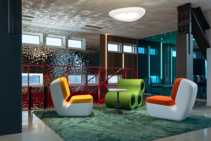 内饰概念的灵感来自不同的元素;天空,海洋,森林,地球。闪亮的钢板与原始混凝土地板、鲜艳的色彩、绿色和定制的细木工制品相得益彰,共同营造出个性。工作环境适合游戏创作者,具有出色的人体工程学、声学和照明设计。为未来的成功和发展提供功能。#办公室装修设计#