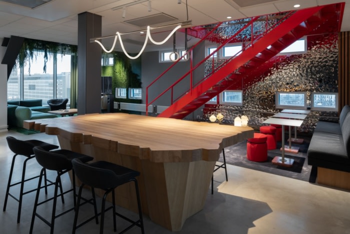 主要的设计理念是通过中央楼梯将两层楼连接起来,代表办公室的(红色)心脏。然后,周围的空间被划分为休息室、工作场所和会议场所,这些场所的灵感来自天空、海洋、森林和地球等元素。闪亮的不锈钢面板将光线反射到天花板上,营造出耀眼的水景。墙板由橡木和驯鹿苔藓制成。天花板的一部分被漆成天蓝色,带有类似于程式化云朵的吊灯。#办公室装修设计公司#