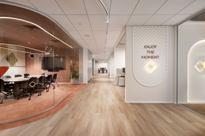 设计原则侧重于融入一系列坚实而优雅的材料,并搭配平衡和互补的色调。这种组合创造了一种永恒的配色方案,在空间中灌输了一种宁静的感觉。其目的是打造一个不仅功能性而且舒缓的环境,促进平静和专业的氛围。此外,还引入了充满活力和轻盈的品牌元素,以迎合劳动力中的年轻群体。这种能量的注入确保了空间不仅宁静,而且引人入胜且充满活力,反映了年轻员工的活力。#办公室设计装修公司#